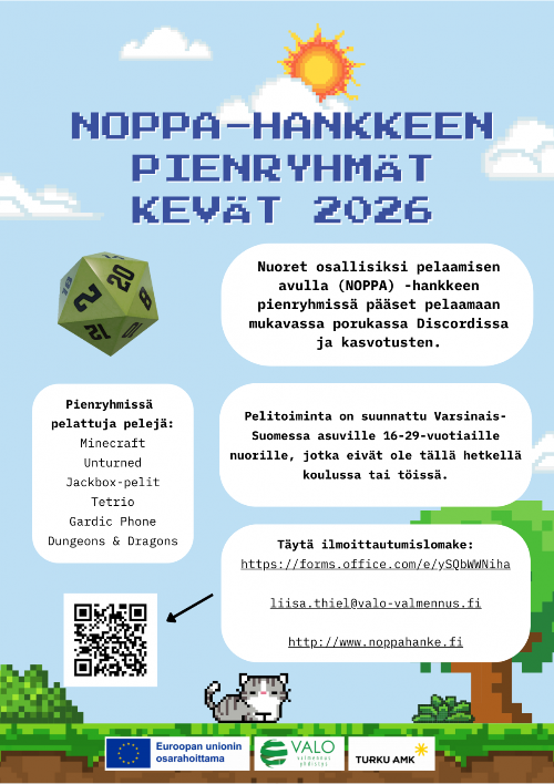 Etsitkö tekemistä ja seuraa, jos et juuri nyt opiskele tai käy töissä? Tule mukaan Noppalaisten pienryhmiin! Toiminta on suunnattu 16–29-vuotiaille varsinaissuomalaisille nuorille, joita kiinnostavat pelit ja yhdessä tekeminen.